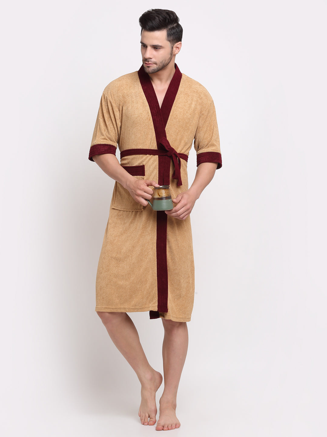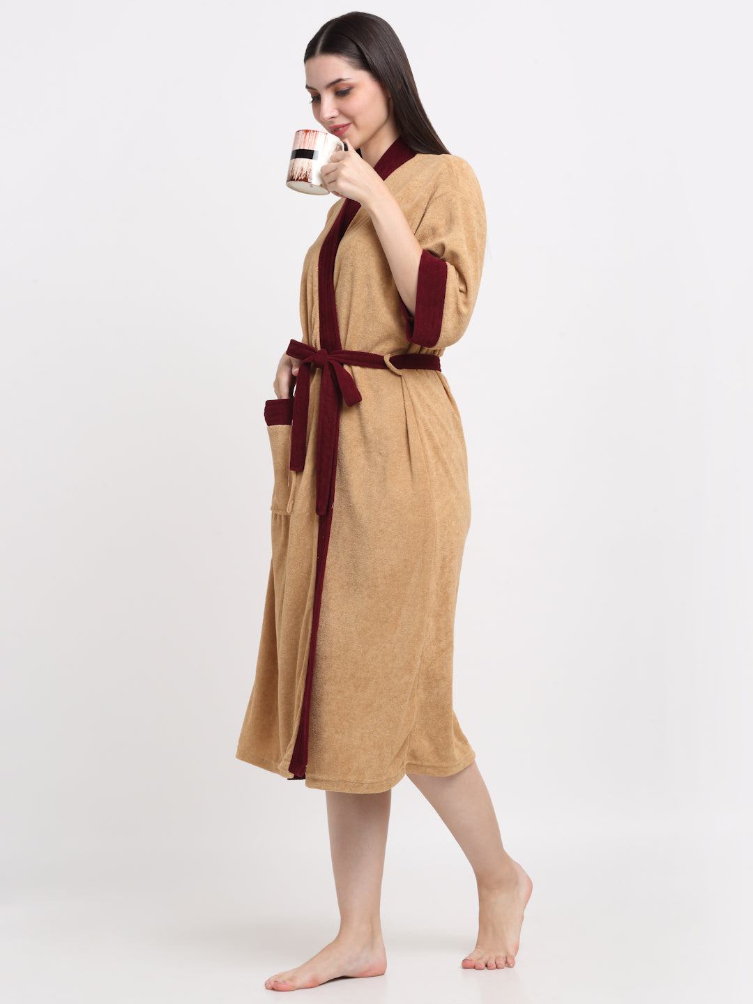 Camel & Wine Contrast Bathrobe – Kimono Collar, 3/4 Sleeves, 1 Pocket