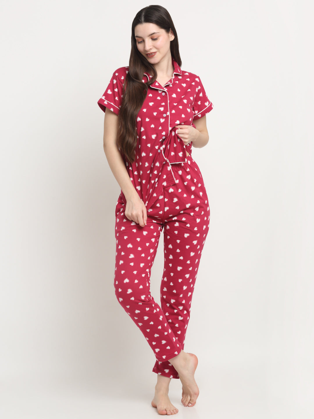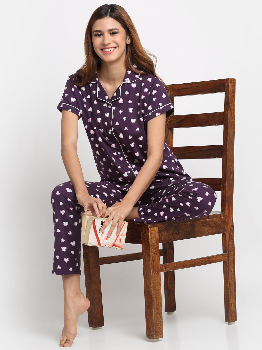 Wonderlady Cotton Nightsuit Set of Shirt & Pyjama Plum Heart with Pockets | Creeva