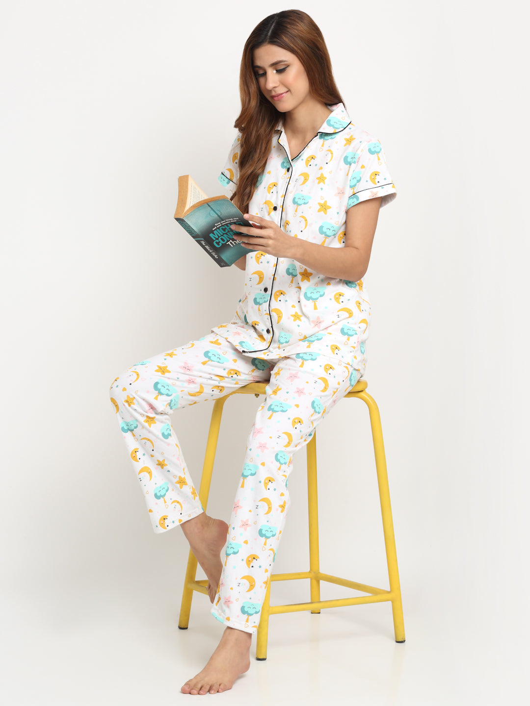 Wonderlady Cotton Nightsuit Set of Shirt & Pyjama Starlight with Pockets | Creeva