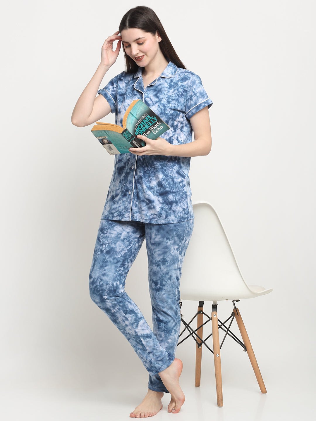 Wonderlady Cotton Nightsuit Set of Shirt & Pyjama Blue Tie-Die with Pockets | Creeva