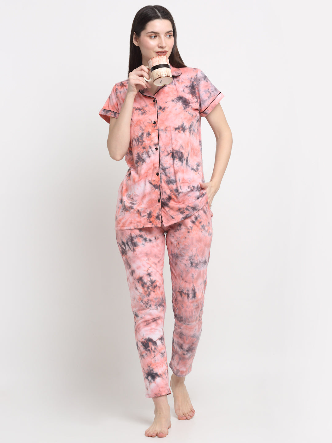 Wonderlady Cotton Nightsuit Set of Shirt & Pyjama Coral Tie-Die with Pockets | Creeva