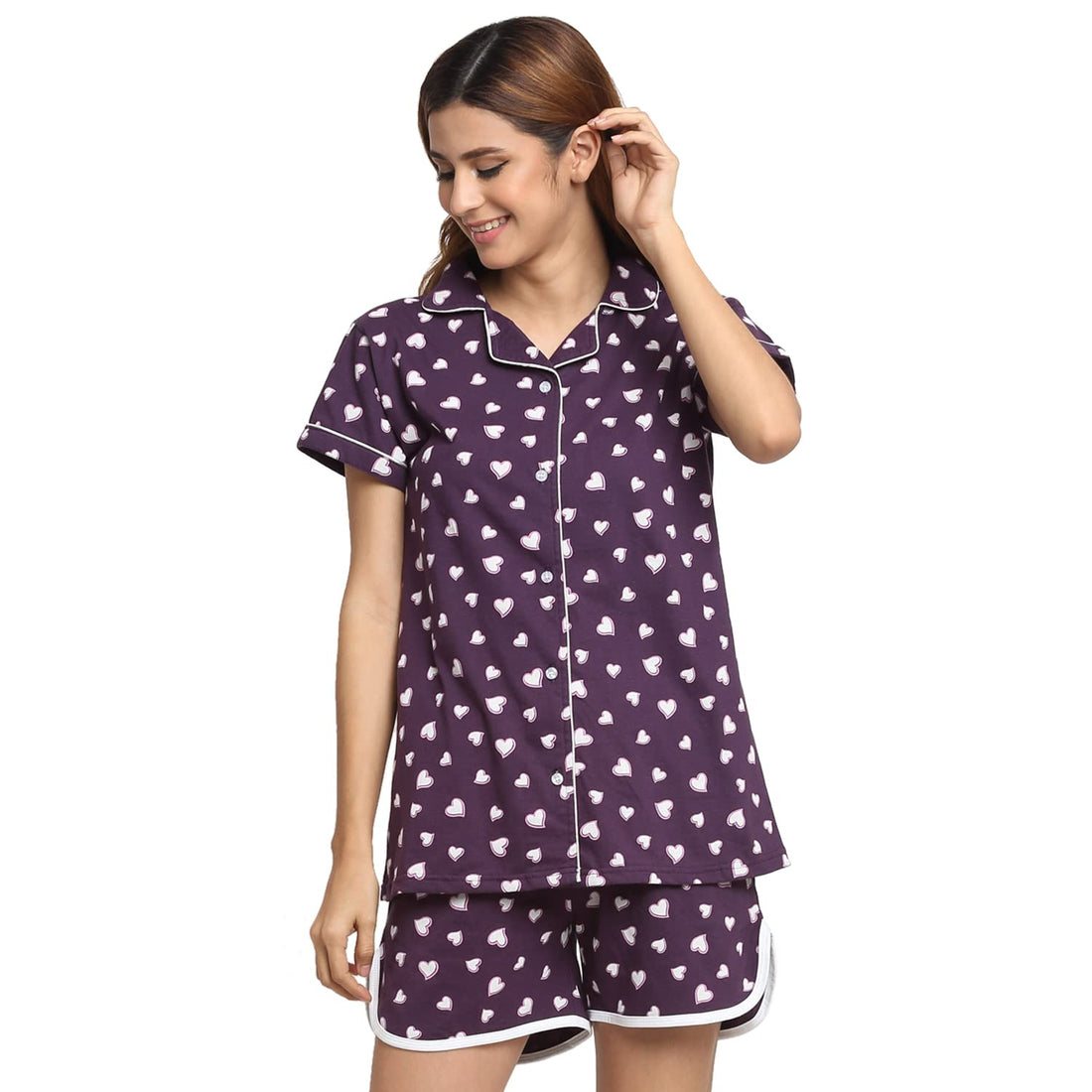 Wonderlady Cotton Nightsuit Set of Shorts & Shirt Plum Heart with Pockets Medium Size | Creeva