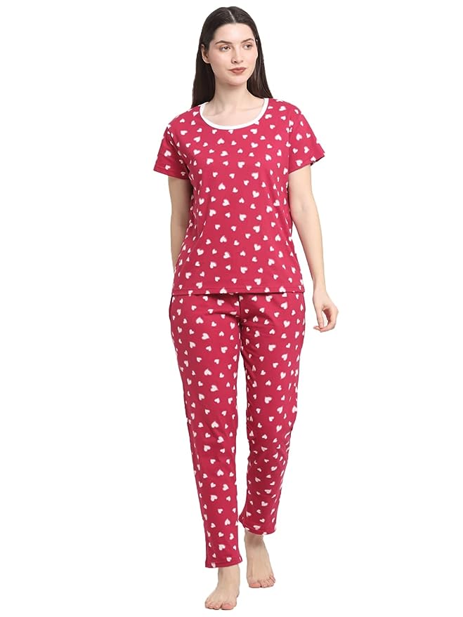 Wonderlady Cotton Nightsuit Set of Shorts & T-Shirt Plum Heart with Pockets Medium Size | Creeva
