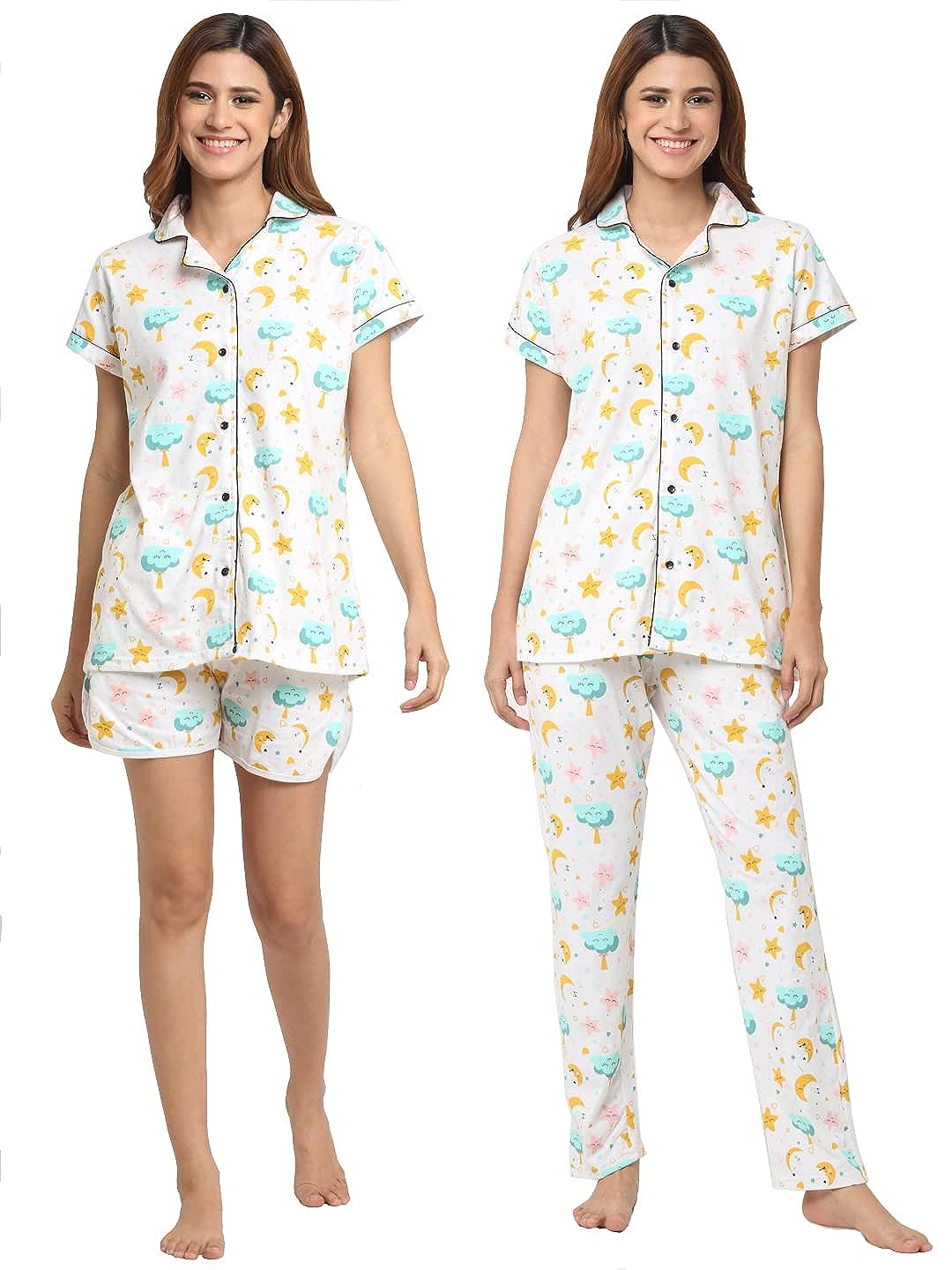 Wonderlady Cotton Nightsuit Set of Pyjama, Shorts & Shirt Starlight with Pockets Medium Size | Creeva