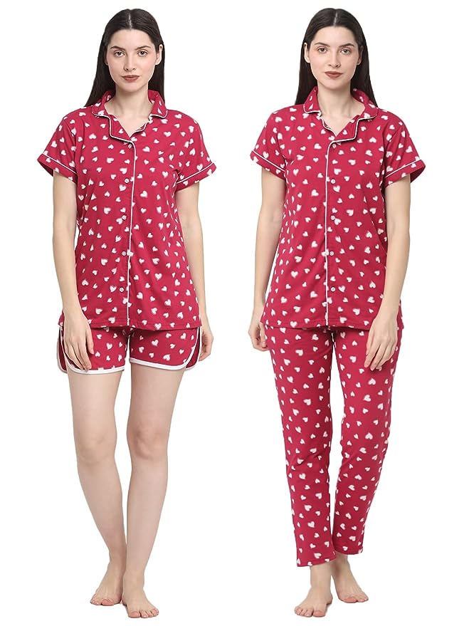 Wonderlady Cotton Nightsuit Set of Pyjama, Shorts & Shirt Cherry Love Heart with Pockets Medium Size | Creeva